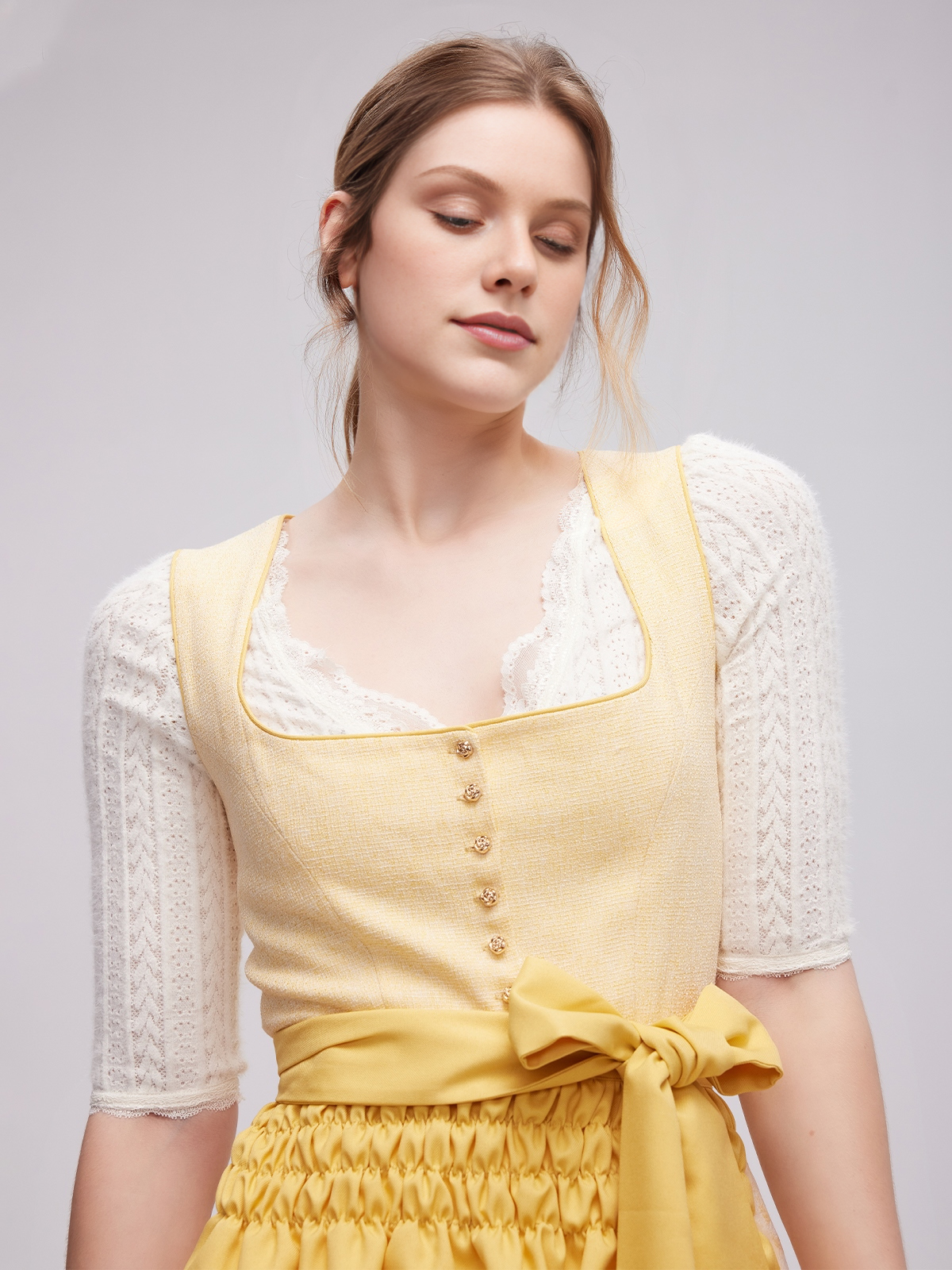 - Modern: Gelb, Pink oder sogar Schwarz bringen einen frischen Twist. Ein leuchtend gelbes Dirndl (wie auf diesem Bild) wirkt jugendlich und lebendig.